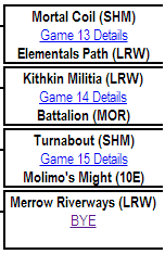 20. Game 13: I know Elementals’ Path is a crazy mess…but I’m picking it to win. It’s got ramp, and the flexibility of Evoke, and I think it can shuffle off the slow-moving Mortal Coil.