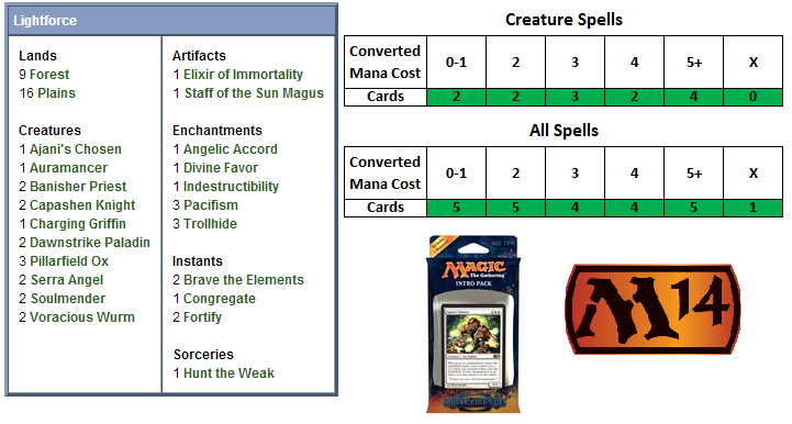 Lightforce has the least amount of creatures in an Intro Pack deck in Magic 2014, an honour it shares with Fire Surge. That means that it does a lot of its lifting through its spells and enchantments, and it comes as little surprise that this breaks somewhat evenly between the auras and lifegain.