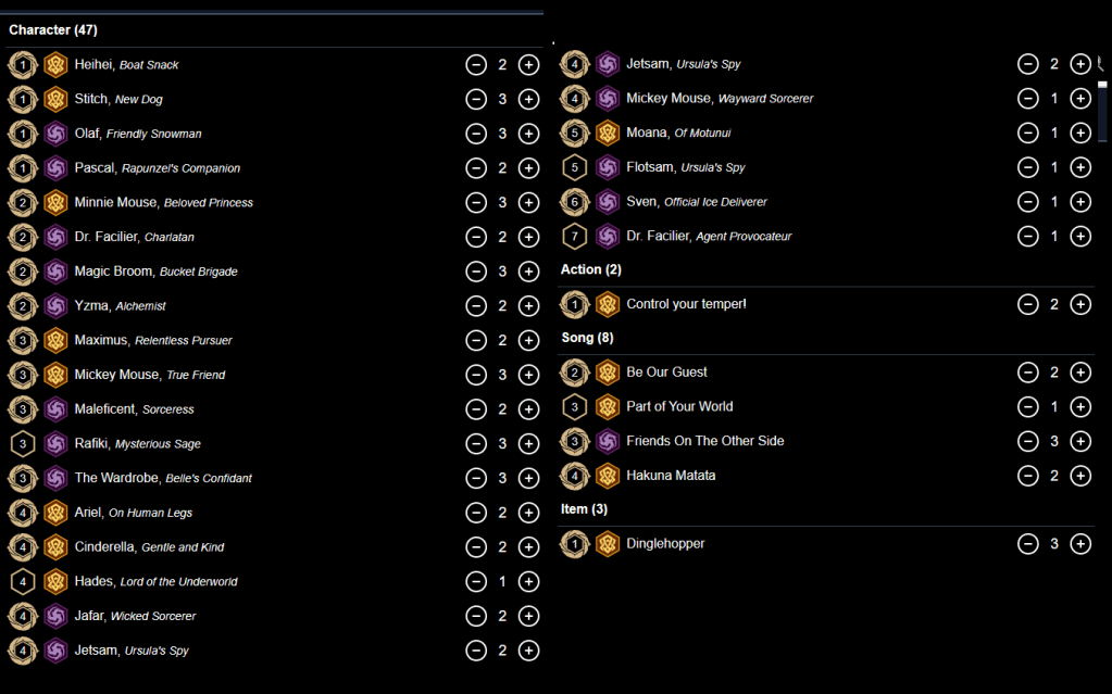 So here’s how the deck breaks down. Deckbuilder is at Dreamborn.ink, card image links from Lorcana Player.