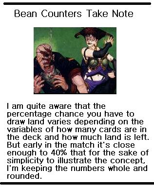 Let’s put this another way: you’re unlikely to get a land in one draw; likely to get a land in two draws, and (statistically) certain to get one every three draws. That means by the time turn 4 rolls around, you’re in good shape, but let’s go from there assuming a land drop every three turns.