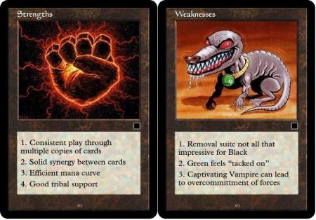 Magic 2011 has presented us with three decks which pair opposing colours: Blades of Victory (W/B), Reign of Vampirism (B/G), and Breath of Fire. As reviewed here, Blades had a very successful model: use a creature-based strategy as your primary win condition, and use a splash of a second colour in support of the primary. For Blades, this meant an army of White Weenies with some Black removal to get them through.