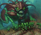 Continuing the lamentable trend of really dumb deck names (the last deck always invoked Emeril Lagasse for us) is Mirrodin’s Wicked Big, a relative rarity amongst preconstructed decks: mono-Green! Although at the time mono-Green beats decks were relatively common (see: Judgment’s Painflow, Legions’ Elvish Rage), the next block’s Snake’s Path from Champions of Kamigawa would be the last non-Core Set deck of this type. The premise behind Wicked Big is about as straightforward as it gets: cast huge creatures and beat on your opponent with them. This being Mirrodin, of course, there’s a subtheme of artifact hate as well.
